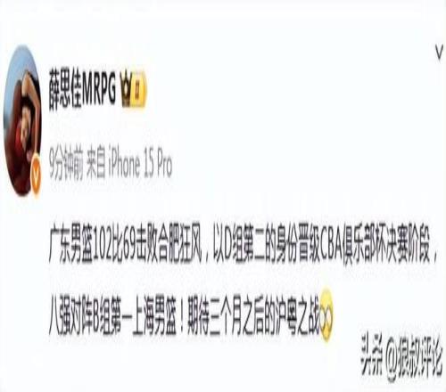 根據賽制的規則,廣東男籃102比69擊敗合肥狂風,以D組第二的身份晉級CBA俱樂部杯決賽階段,八強對陣B組第一上海男籃!期待三個月之后的滬粵之戰。