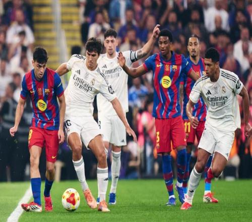 在上賽季的西超杯決賽,巴塞羅那5-2送給銀河戰艦一場恥辱性的失利問鼎冠軍,為了能夠實現衛冕的目標,弗里克此役也是毫無保留,祭出了433的體系,霍安加西亞鎮守龍門,巴爾德、加西亞、庫巴西和孔德構筑后防,佩德里、德容和費爾明坐鎮中場,拉菲尼亞、萊萬和亞馬爾組成進攻三叉戟。