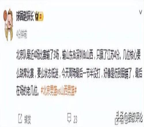 北京隊最近4場比賽輸了3場,輸山東&深圳&山西,只贏了江蘇4分。幾位核心要么缺席比賽,要么狀態低迷,今天周琦最后一節半沒打,好像是傷到眼睛了,最后在場的老幾位。