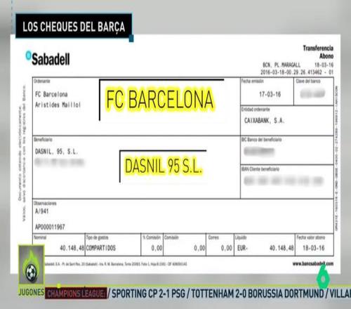 七家銀行已向巴塞羅那第一號指示法官提交相關文件,文件明確顯示,巴薩每月會向內格雷拉旗下的Nilsad SA公司開出24張支票,而各相關賬戶之間,僅本票與支票的往來金額就高達19萬歐元。