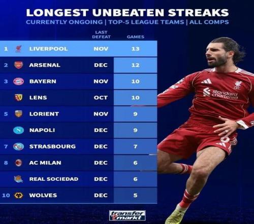 德轉(zhuǎn)盤(pán)點(diǎn)了目前五大聯(lián)賽球隊(duì)各項(xiàng)賽事現(xiàn)存最長(zhǎng)不敗場(chǎng)次榜,具體如下: