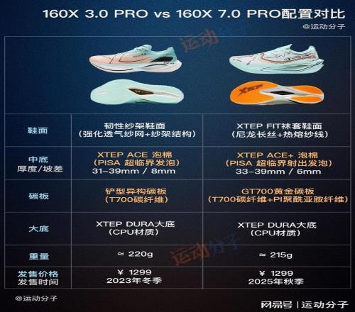 發(fā)售僅半年的160X 7.0 PRO緊隨其后。前兩周的廈門馬拉松破三選手里,160X 7.0 PRO的穿著率達到了54.3%,斷崖式領先其它鞋款。160X 7.0 PRO的泡棉腳感偏韌,外加首創(chuàng)的GT700碳板(T700碳纖+ PI聚酰亞胺纖維編織鋪設),在長距離后的能量回饋表現(xiàn)出色,很有可能完美繼承160X 3.0 PRO的冠軍基因。